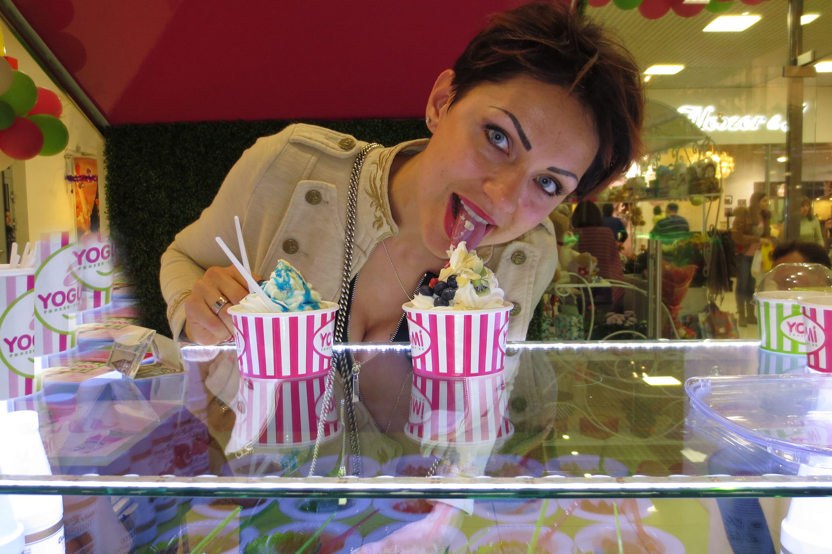 Покупательница замороженного йогурта в фитнес-баре YOGUMI в Великом Новгороде слизывает йогурт не отходя от витрины топпинг-бара с разнообразными наполнителями.